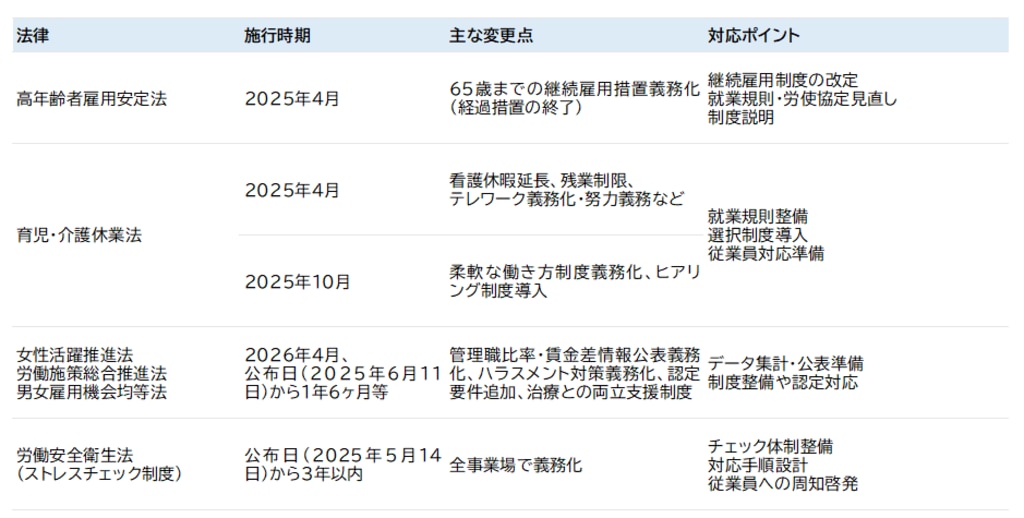 複数の法改正が重なり、就業規則や制度改定への早期対応が求められています。
