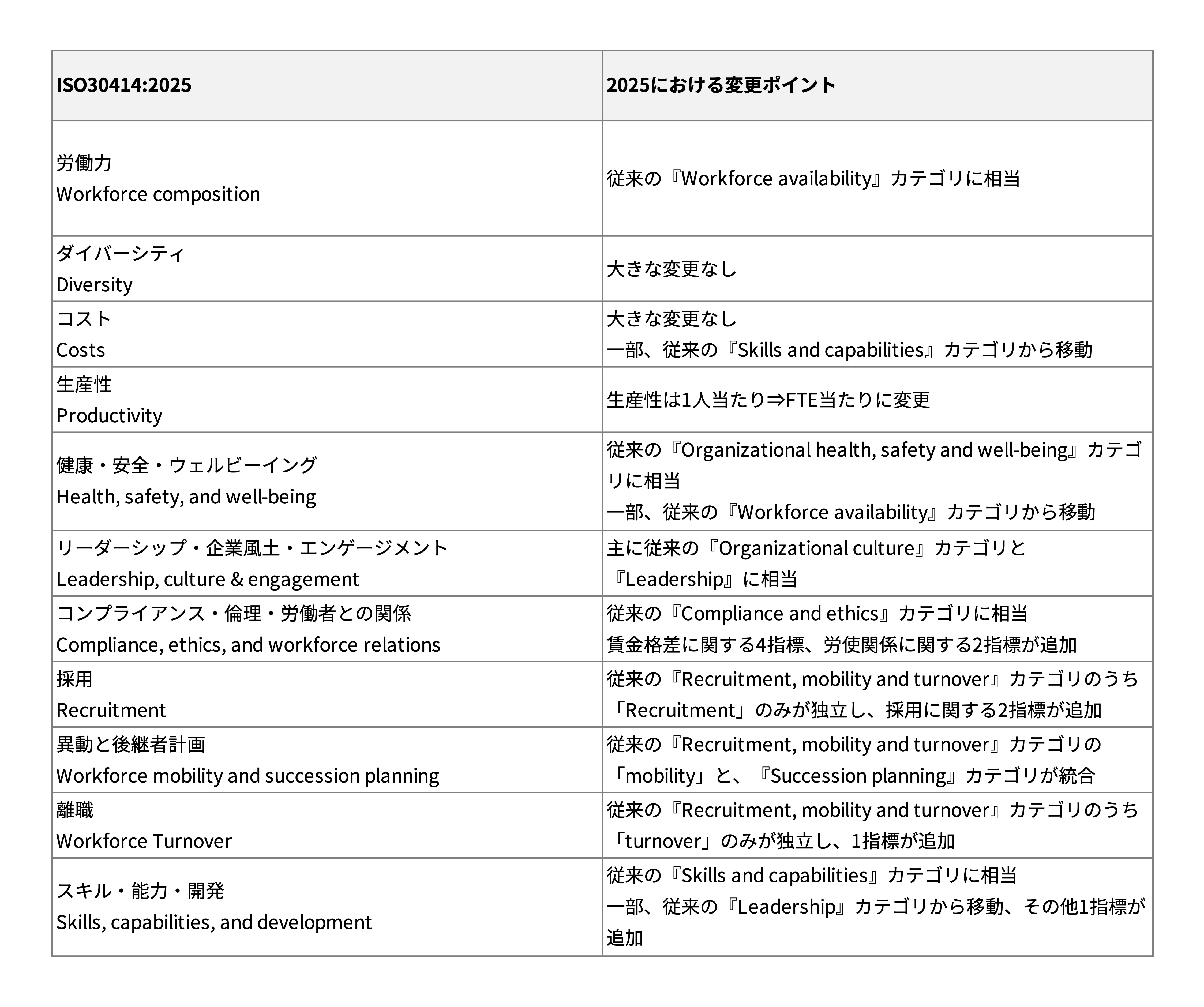 今回は、指標の変更点を中心に解説しましたが、それ以外にも、AI・HRテクノロジーの利用や、ガバナンス強化に関するの観点が多く盛り込まれた改訂となりました。単なる指標の改訂としてではなく、人的資本を実効的に管理し、企業の取り組みを促進するためのきっかけとして、企業の意思決定の力に変えていきましょう。